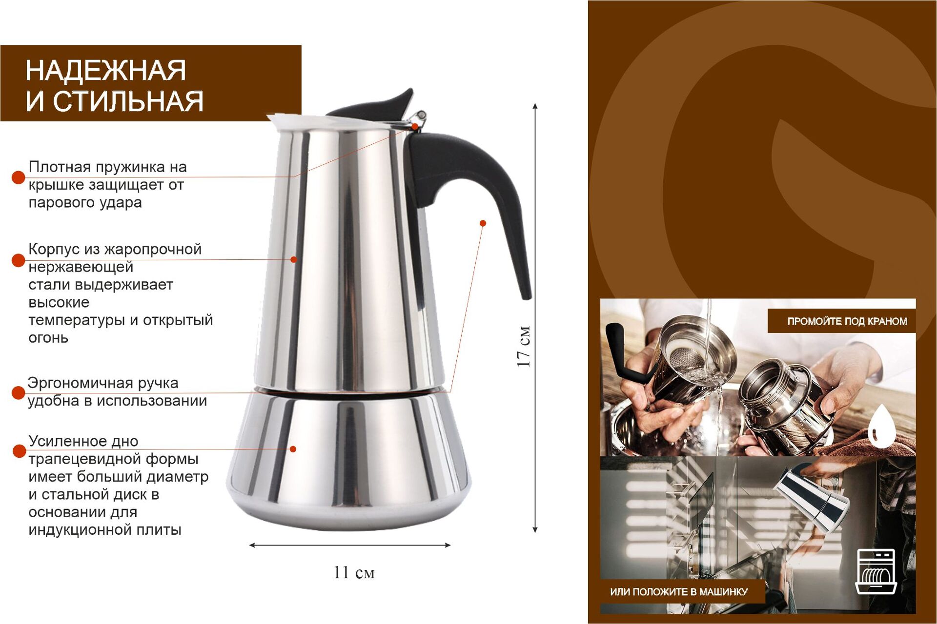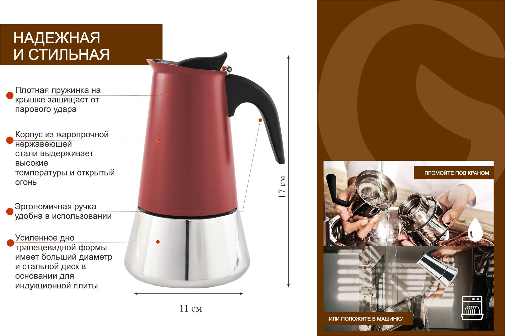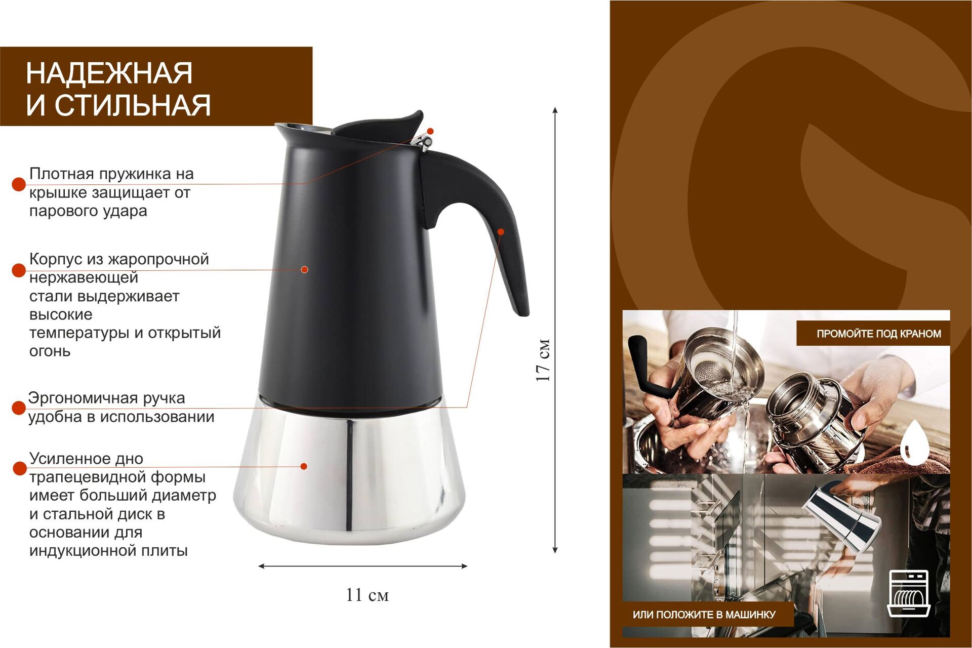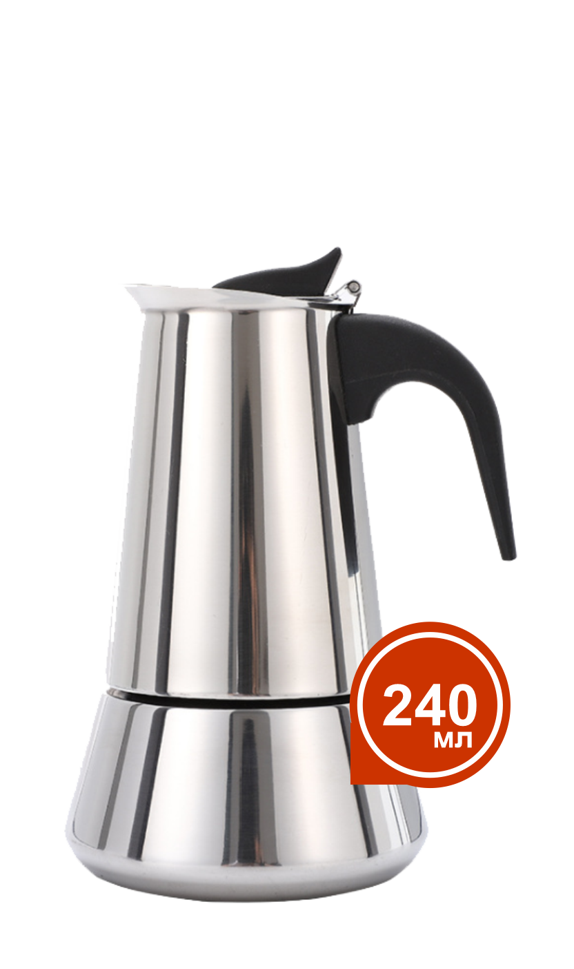 Подходит для всех видов плит, включая индукцию: электрическая, керамическая, газовая плита, индукционная, открытый огонь на костре подойдут для приготовления кофе в данной кофеварке.