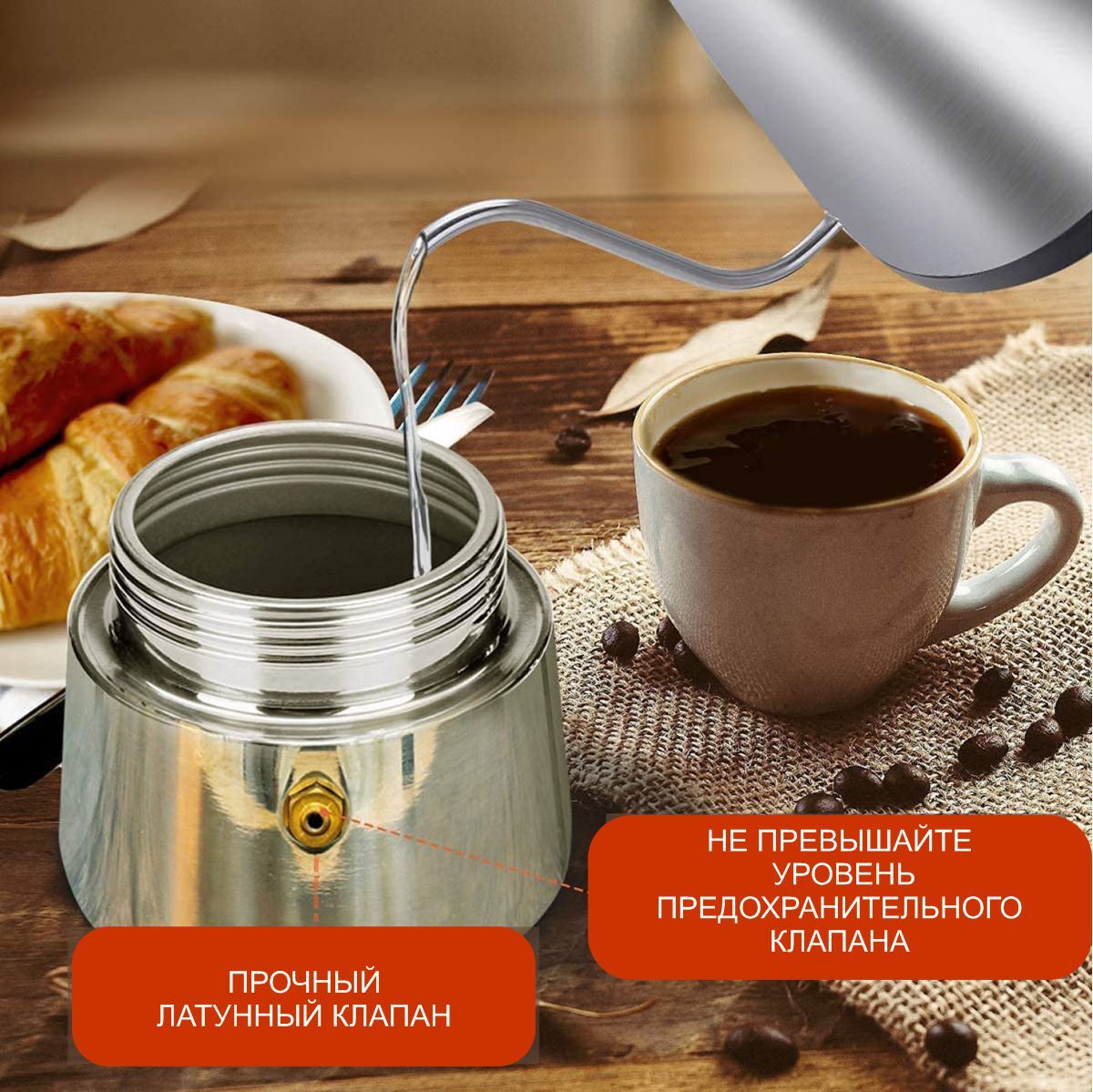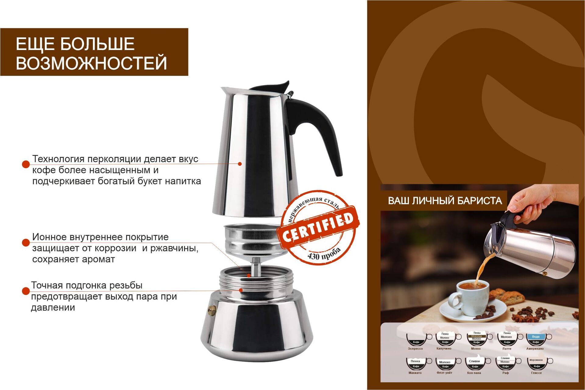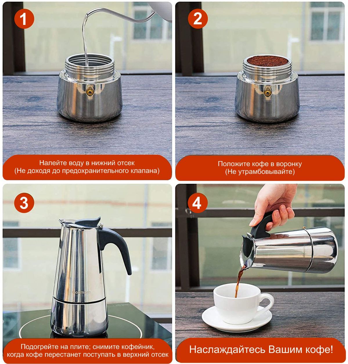 Подходит для всех видов плит, включая индукцию: электрическая, керамическая, газовая плита, индукционная, открытый огонь на костре подойдут для приготовления кофе в данной кофеварке.