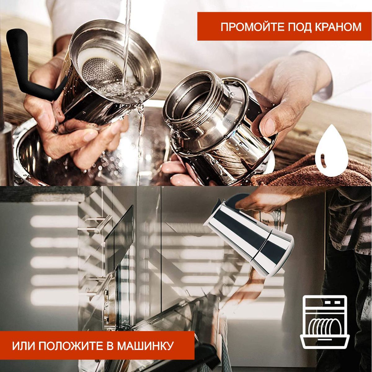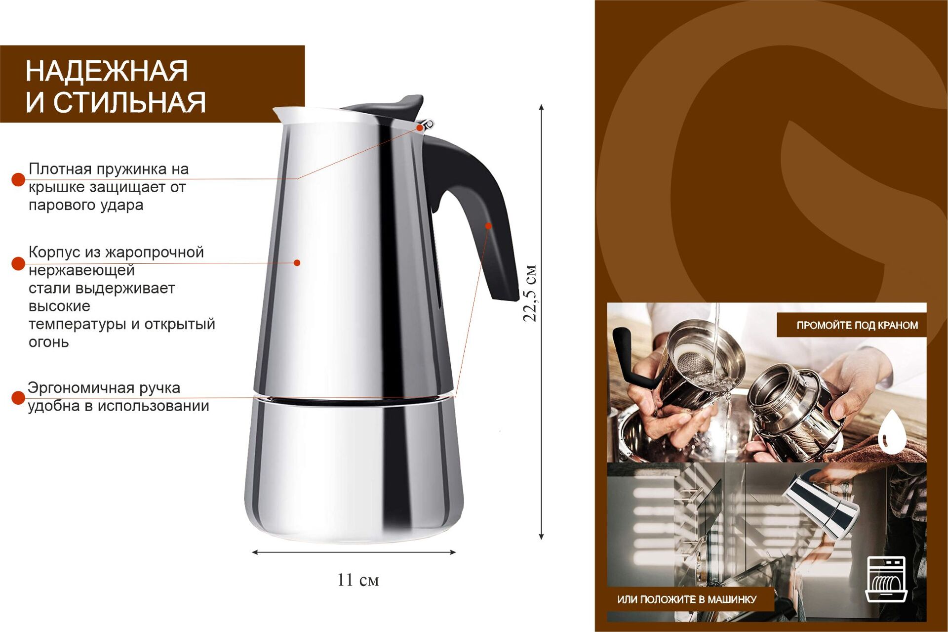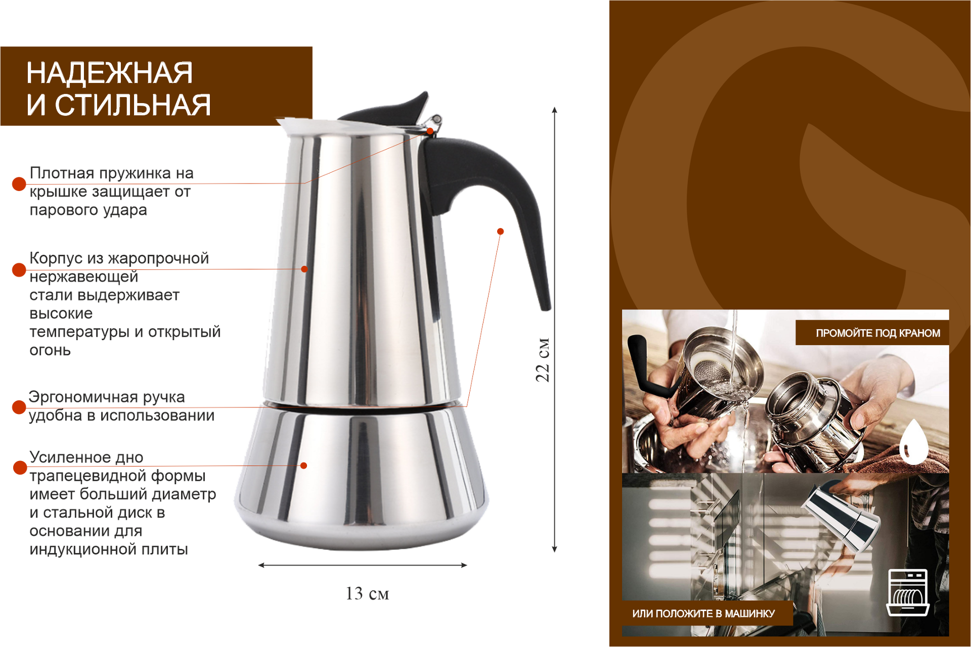 Усиленное дно, можно мыть в посудомойке кроме нижнего резервуара, ненагревающиеся ручки