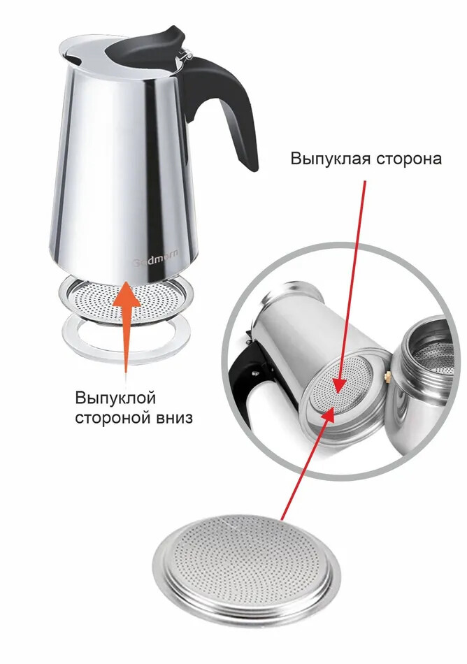 В процессе установки фильтра может казаться, что уплотнитель большой и не подходит для кофеварки, но необходимо продолжить установку и по итогу плотно прижать его до соприкосновения с поверхностью кофеварки, так чтобы он плотно вошел между стенкой кофеварки и стальным фильтром.